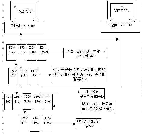 控制系统核心部分是西门子PLC S7-300系统,称重采用集成的称重模块,上位机用研华工业控制机,倾动和氧枪采用交流变频器,操作界面采用非常流行的WINCC 人机接口软件。