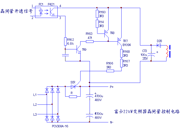 开机检测,发现主电路无充电接触器等相关元件,经测量确认,整流模块PCV300A-16M内含三相整流桥电路、单向晶闸管及开关电源的开关管等元件,结构上较为特殊。