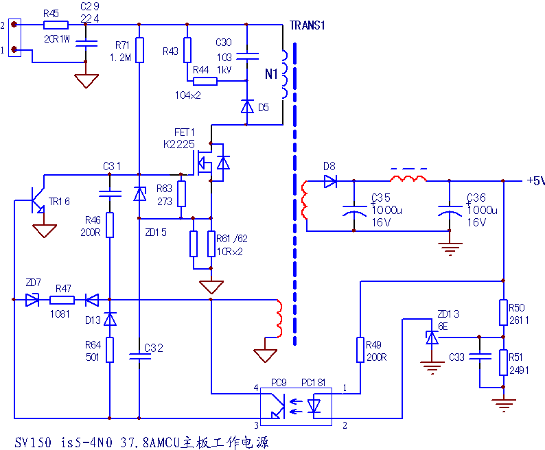 故障现象为面不亮,或时熄时亮,有时报欠电压故障。经检查确实故障在如图一所示的开关电源电路。为维修方便,测绘了图二所示电路,仅绘出了+5V负载供电电路,其余正、负15V、24V供电省略未画。