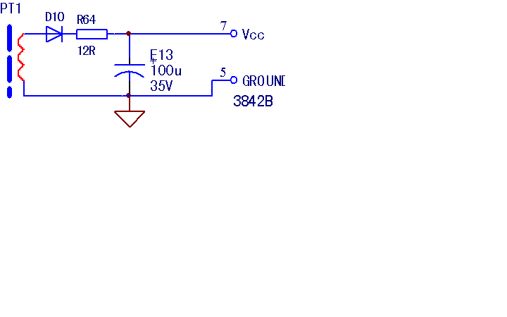 此时,测振荡芯片3842的7脚电压为12.5V,感觉偏低一些。3842芯片的起振工作电压为16V,欠电压动作阈值为10V。12.5V虽未引发欠电压动作,但经内部输出级功率管本身造成的压降和开关管栅极的压降,加至开关管栅极的驱动电压已经较低,导致开关管的激励能力不足,带载能力变差。此时(当+5V电压反馈采样电压变低后),3842的6脚输出脉冲虽然已达最大的占空比,但因开关管的欠激励,使Id偏小,开关变压器PT1储能不足,引发负载电压的大幅度跌落。