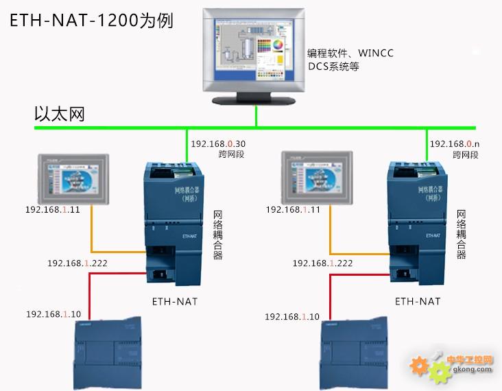 在大型工厂中,不同设备可能位于不同的网段,但它们需要相互通信以完成特定的生产任务。例如, PLC (可编程逻辑控制器)和 CNC (数控机床)可能位于不同的网段,但它们需要在线编程和数据采集,跨网段通讯技术可以解决这一问题,跨网段通讯可以实现不同设备之间的数据共享和管理,对于跨地区的远程运维,跨网段通讯技术可以解决带宽不足、延迟过高等问题,确保PLC程序能够成功下载和调试,提高远程调试的效率和可靠性,对网络熟悉的工程师会选用路由配置来实现跨网段,但是设置复杂容易会乱,对于新手是很不有好的,可以尝试使用德嘉出品的网络耦合器ETH-NAT来实现这个功能,通过浏览器两步就可设置完成,轻松实现跨网段通讯。