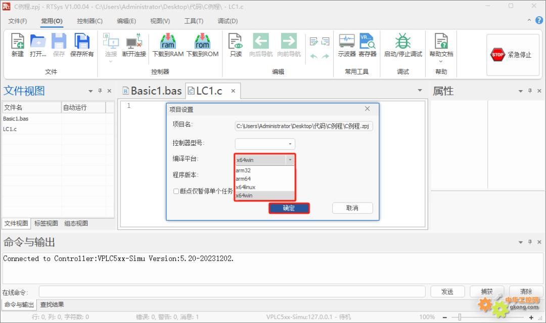 5.在弹出窗口“编译平台”一栏中点击下拉列表,在下拉列表中选择相应的编译平台后单击“确定”,即可完成编译平台设置操作,编译平台的选择可参照评论区内容“编译平台选择参考”。