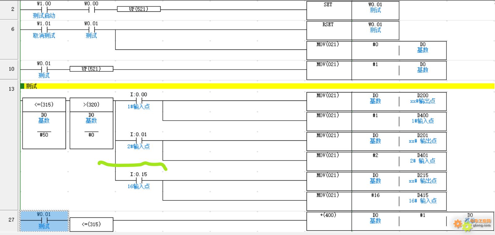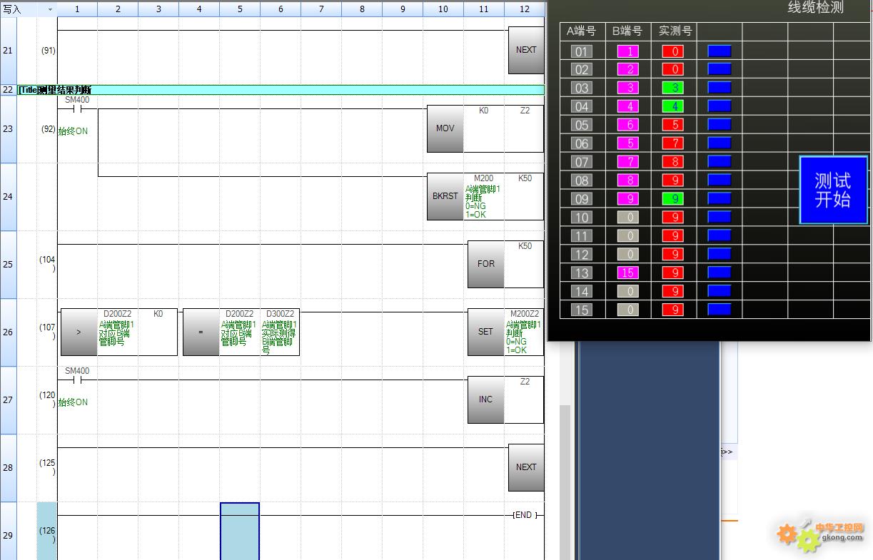 4、将获取的输入点编号与设定的编号做对比,一致亮绿灯不一致亮红灯。