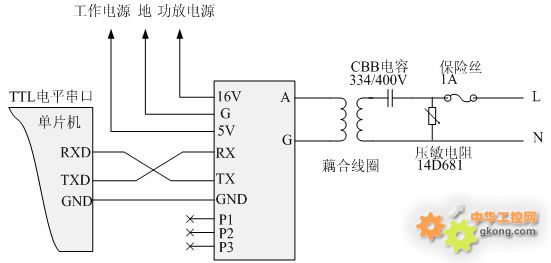 1 16V 模块载波发送工作电源,工作范围为9-16V,功率为400毫安
