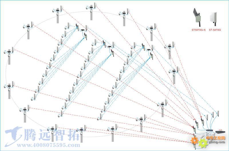 因为现场有60个监控点,需求带宽比较大,2.4G无线设备不能满足高带宽需求,所以考虑采用5.8G的数字无线监控设备。最远监控点离监控中心只有1KM距离,所以决定发射端全部采用数字无线网桥ST58T8G,接收端采用可以外接角度天线一对多接收的数字无线监控设备ST58T8G-N。