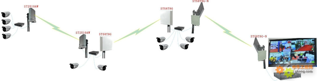 第一个路口有4路图像由交换机整合通过一台数字无线传输设备ST2510AW传输到1KM处的第二个路口,第2个路口有2路摄像机与前端的4路图像整合由一台5.8G无线网桥ST58T8G传输到800米处的第3个路口,第3个路口有4路图像与前面的6路图像整合由一台外置天线的5.8G无线网桥ST58T8G-N传输3公里到监控中心。无线网桥接收所有信号之后接入一台NVR,可以方便实时观看监控信息和对图像信息进行存储。