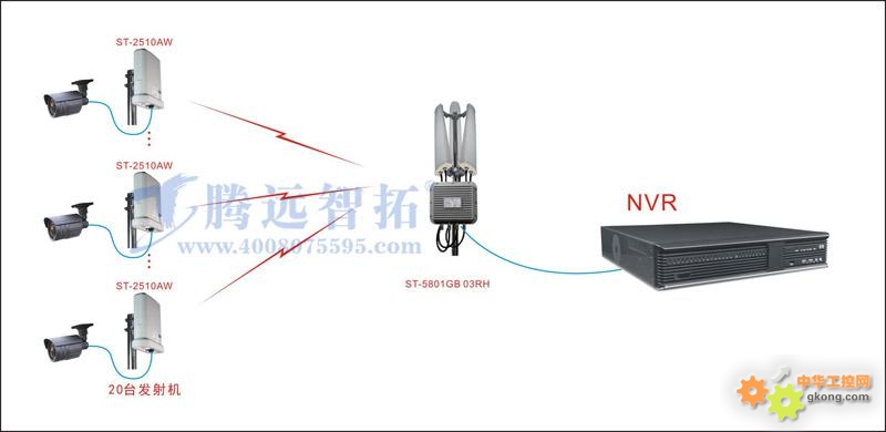 在连接图中,我们可看到前端采用20台无线网桥 ST2510AW作为发射,中间无阻挡传输350米,后端采用1台无线网桥ST5801GB03RH(内置3个2.4G的模块,高带宽骨干设备)接收前端20个信号,再进入1台NVR来监控前端的画面。本次方案采用腾远智拓无线传输。