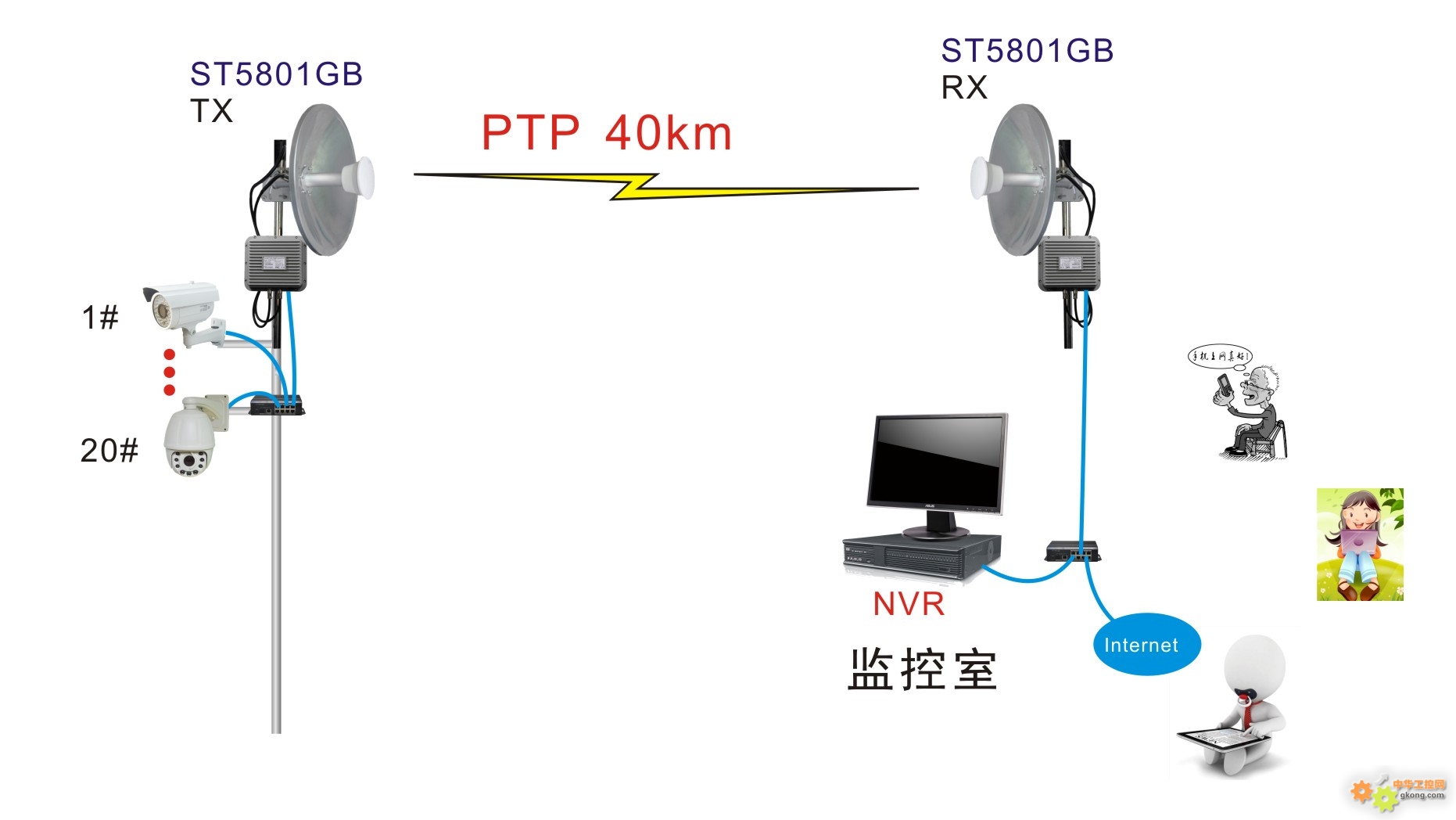 点对点的无线网桥连接两个不同地方的网络,也是一种较为简单的传输方式,也可以说是直线传输,一般由一对桥接器和一对天线组合而成,一对一的发射与接收。其传输距离较远,监控点位分布广泛,腾远智拓无线网桥支持同步信道的功能,只需改变一方的频道,另一方便会自动改变到相应的频道。无线网桥ST5023PRO设备融合先进的软件机制,专有的点对点通信机制利用动态时分双工技术为所需传输方向动态分配带宽,远距离传输可达100公里左右。