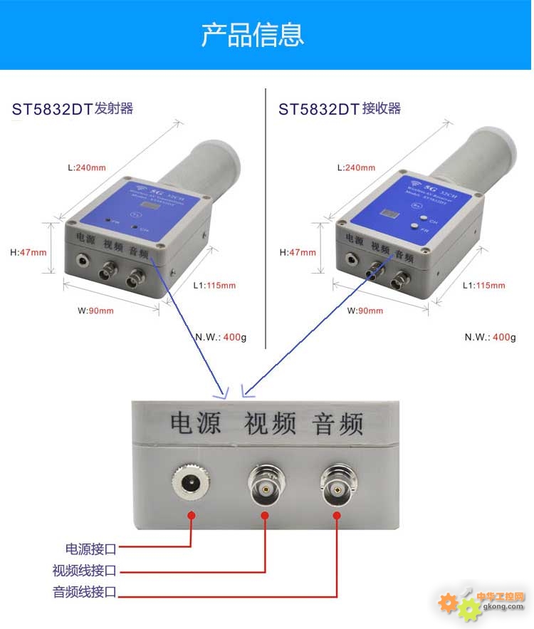 ST5832DT为经济型模拟无线微波影音传输系统,且是电梯专用的,采用5.8GHz频段无线微波来传输音视频信号,可直接与模拟的监控摄像机,DVD,数码摄像机进行连接,在空中进行无线音视频传输。32个选择频道,分为四组,每组八个。选用了较高的频率,具备了较强的抗干扰性,图像传输清晰稳定。传输距离可达2公里。体积小巧,安装调试简单,在电梯监控环境下,非常实用。