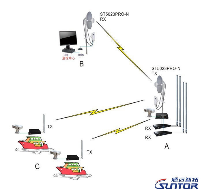 两艘搭载了COFDM移动视频传输设备6200DataD+全线天线的巡逻船从C点海湾出发,将监控视频信号传输到A点人工岛上的接收端,通过交换机将视频信号传送到大功率无线网桥ST5023PRO+定向天线,再通过这款大功率无线网桥传输到近20公里的B点——该自然保护区的管理监控中心。