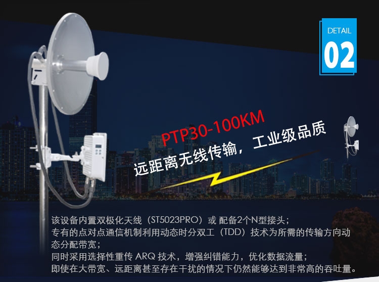 实际上,别说50公里了,40公里的无线传输距离很多无线网桥都无法达到。据了解,这款无线网桥ST5023PRO是应用了当前世界领先的TDD时分正交频分复用技术和2×2MIMO突破性技术,具有十分高的抗干扰能力,而且延迟很小,在测试时传输系统64字节的延时<2ms、支持数字化音视频、网络数据等数据传输,配合34dBi的增益天线使用,在传输距离达到100公里时,吞吐量也可以达到150Mbps。