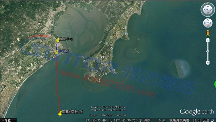 场主的家为了监控中心,距离养殖场18公里左右,由于养殖场与监控中心之间有阻隔,所以在海岸边设置了一个中转点。如下图所示: