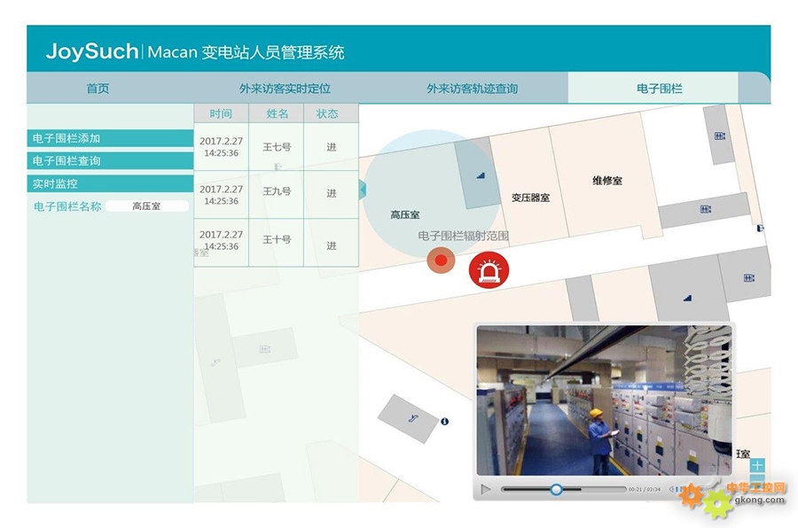 管理人员可在后台查看外来参观人员进出变电站的时间、活动轨迹等信息;可对指定区域设置电子围栏,外来人员超越规定范围时自动给出报警信息,提醒监护人或运营人员。