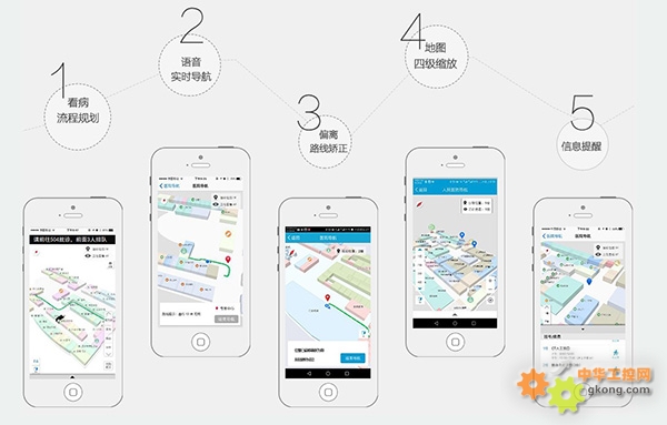 病患在医院内的任意位置打开手机,使用医院的微信公众号或者APP,可立即显示当前所在位置及医院的导航信息;可以为病患提供看病流程规划、实时语音导航、信息提醒等服务;经过进一步的开发,医院还能在系统中向病患介绍医院概况、专家介绍、医疗实力、先进技术、科普小知识等内容;病患可通过手机查看科室门诊排队状况,预约人数及等待时间等数据,为病患提供全方位的医院服务。