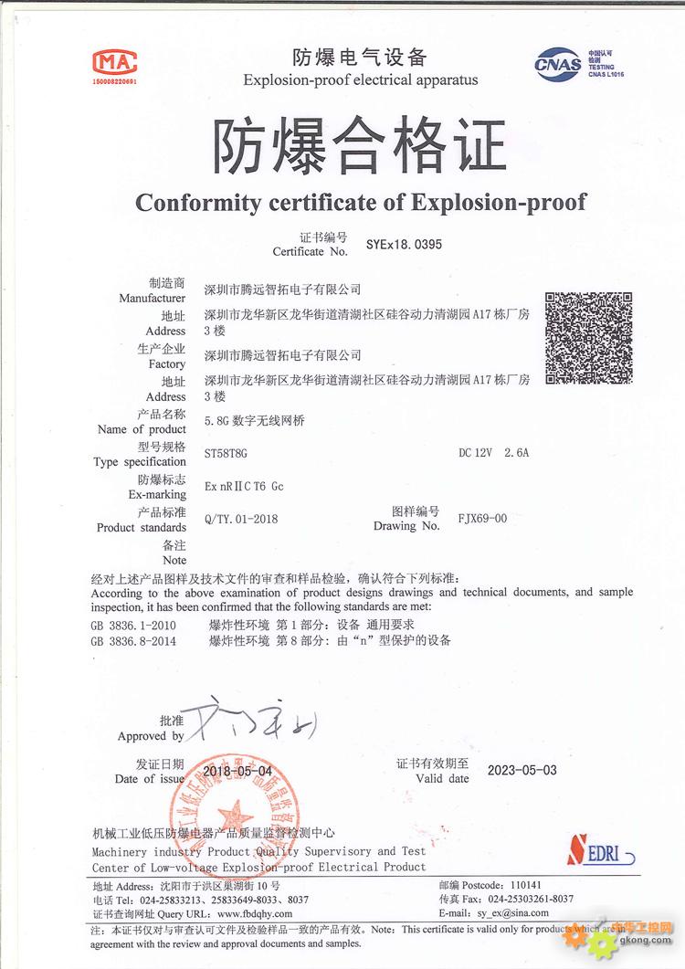 腾远智拓ST58T8-FB系列高功率防爆型无线网桥,具有工业、信息化部门认证的无线电型号核准证,并且具有正规的防爆认证书。采用全封闭式金属结构设计,具有防爆、防尘、防盐雾、防腐蚀等功能。支持基站模式、点对点桥接模式、 用户站模式,不同模式之间的配合可实现不同的功效,可以做点对点传输、点对多点传输、自动漫游切换传输。