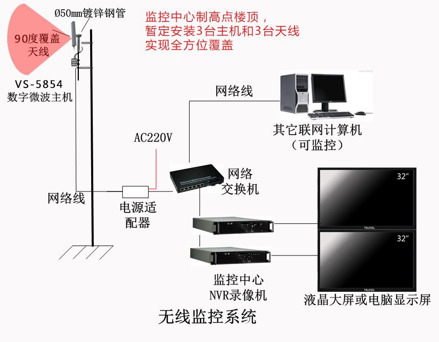 由于监控点位多,传输距离远,整个工程如果实施布线的方式,挖沟埋槽,不但工期长,而且后期维护工作也不太方便,于是客户直接将目光移至无线微波传输上。所有监控头将采用无线传输方式传回监控室进行录像观看统一管理。