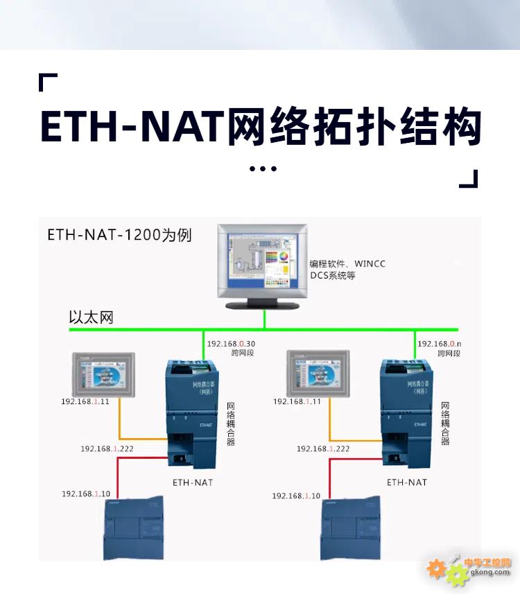 现在现场PLC和上位机不在同一网段内,并且PLC程序无法更改(更改不了IP地址)然后转换成其它的IP,可以在上位机和PLC中间加个网络耦合器,使用大连德嘉ETH-NAT系列网络耦合器就可以轻松实现PLC和上位机不在同一网段内通讯,这种方式尤其是针对现场PLC更改不了IP地址,还要连接上位机情况设计的。