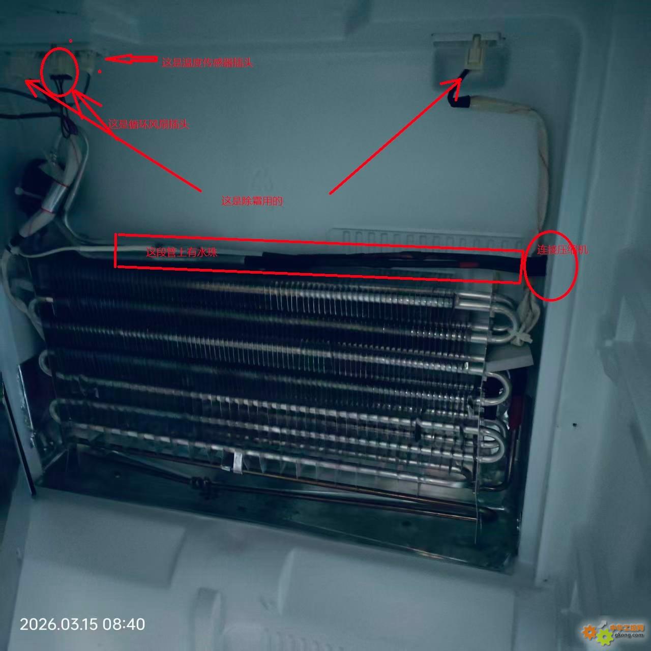 拆开冷冻室就是这图上的东西,压缩机进来是最上端铜管,上面有水珠。这里的冷冻风扇也不转,拆开后面压缩机链接的地方都很干净,不像漏氟。也能听到压缩机启动声与嗡嗡声,压缩机是热的。冰箱上层冷藏感觉是凉的,冰箱上没有任何故障显示。